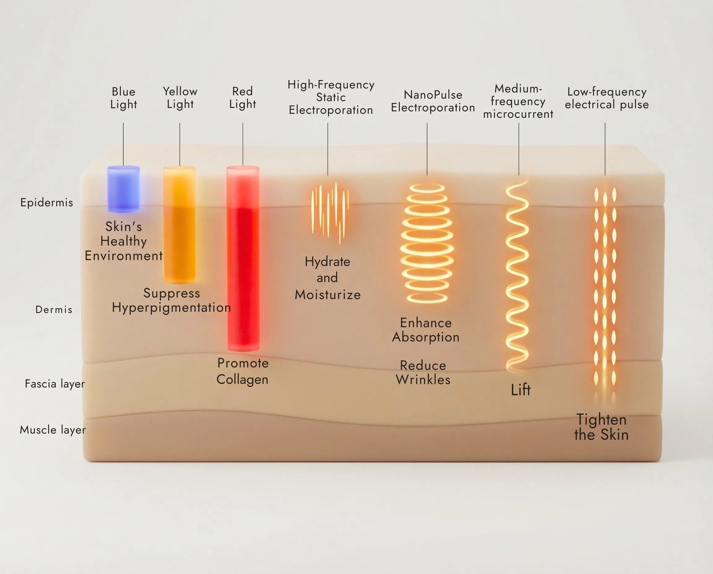 Duration, settings, and intensity adjust intuitively to create a personalised skincare experience.